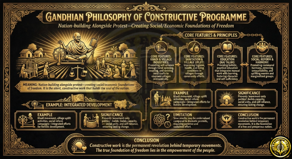 Example: Constructive work—sanitation, village uplift, education, khadi—aimed at collective well-being.